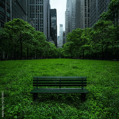 Lush green park bench surrounded by towering skyscrapers in a bustling city