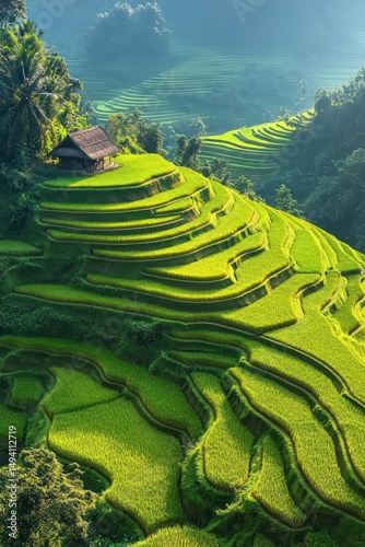 Lush green terraced rice fields on rolling hills with a small wooden hut surrounded by dense vegetation under soft morning light