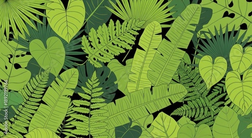 leaf, tropical, foliage, pattern, green, jungle, botanical, plant, background, seamless, illustration, nature, flora, fern, palm, banana leaf, exotic, lush, vibrant, fresh, wild, rainforest, tropics, garden, organic, natural, environment, growth, summer, spring, design, wallpaper, textile, print, texture, decorative, abstract, vector, art, graphic, black background, dark background, healthy, serene, vacation, paradise, ecosystem, biodiversity