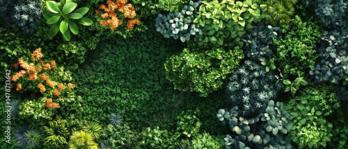Lush Green Vertical Garden Wall Displaying Diverse Plant Life in an Overhead Shot with a Natural and Organic Aesthetic