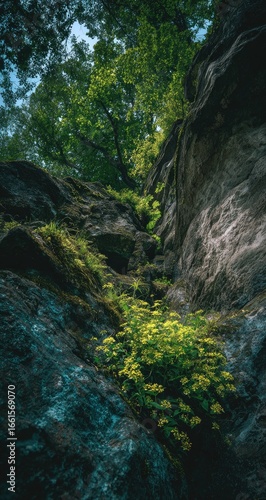 nature, forest, rock, mountain, plant, greenery, moss, vegetation, yellow, green, sunlight, shadow, growth, flora, fauna, landscape, outdoors, wild, dense, tree, leaf, cliff, rocky, earth, stone, dark, light, detail, closeup, perspective, vertical, bottom, upward, natural, jungle, cave, hidden, shallow, sharpened, depth, contrast, texture, colours, beauty, majestic, subtile, wildflower