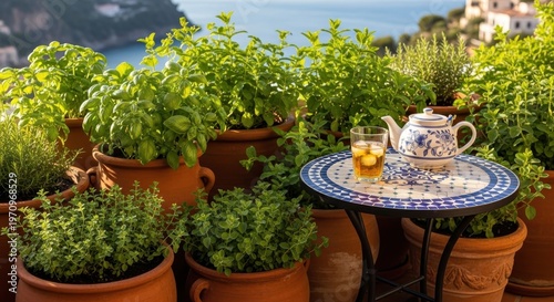 Lush Mediterranean herb garden on a balcony overlooking the sea, with a refreshing drink and teapot.