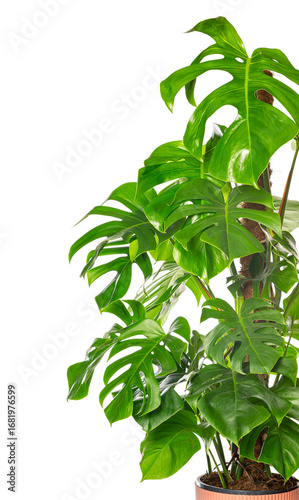 Lush monstera deliciosa plant with vibrant green leaves on white background