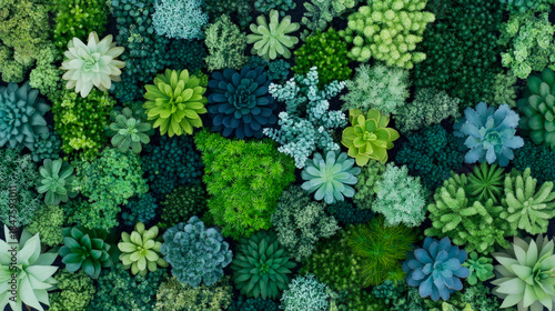 Lush overhead view of a diverse succulent garden displaying various textures and vibrant shades of green and teal, creating a natural botanical background pattern