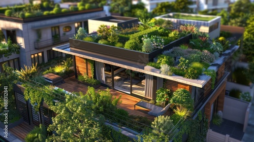 lush rooftop garden on a suburban modern home, complete with sustainable green technology and panoramic views