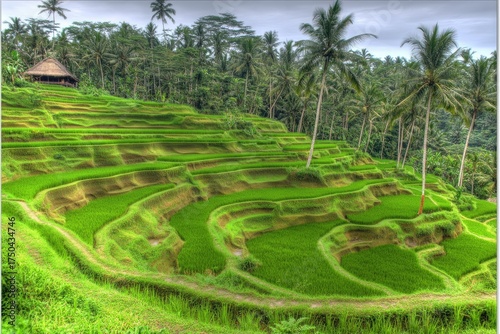 rice, terrace, paddy, green, lush, palm, tree, tropical, indonesia, agriculture, landscape, scenic, asian, nature, beautiful, farmland, cultivated, hillside, mountain, elevation, growth, view, vegetation, farming, rural, scenery, travel, tour tourism, asia, serenity, tranquil, cloud, sky, hut, structure, waterway, irrigation, detail, contour, symmetry, pattern, curve, design, sustainable, tradition, culture