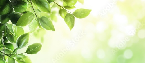 Lush vibrant green leaves gently framing the top left corner against a soft light gradient background, creating an atmosphere of freshness and tranquility