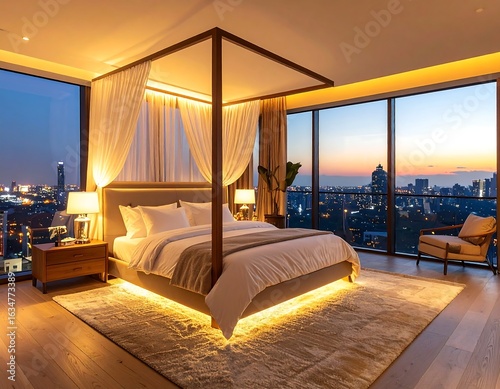 Luxurious bedroom with city view at dusk, featuring a four-poster bed with warm lighting