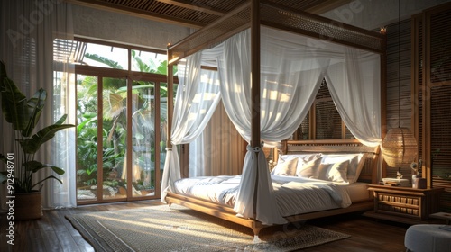 bed, canopy, bedchamber, tropical, wooden, frame, white, sunlight, window, large, retreat, luxury, sun, natural, light, interior, design, room, furniture, modern, minimalist, cosy, relaxing, comfortable, elegant, style, decor, home, house, beautiful, peaceful, serene, plant, green, leaf, jungle, hotel, window, sofa, architecture, living, apartment, lamp, chair, curtain, table, indoor, nobody, curtain