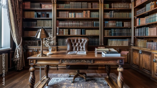 luxurious executive home office with a large wooden desk, leather chair, and classic bookcases filled with literature