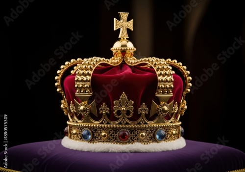 crown, gold, jewellery, royals, regalia, precious, gem, velvet, pedestal, dark, luxury, ornate, metalwork, adorned, royalty, symbol, power, prince, king, queen, princess, tiara, headpiece, famous, expensive, red, purple, gem, blues, cross