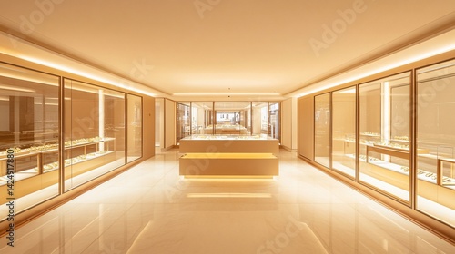 showroom, display, case, interior, design, architecture, luxury, store, retail, modern, gold, yellow, light, illumination, glasses, shelf, product, elegant, stylish, sophisticated, aesthetic, commercial, space, corridor, hallway, aisle, bright, clean, minimalist, contemporary, gallery, boutique, showcase, exhibition, market, shop, sale, window, lighting, ambience, atmosphere