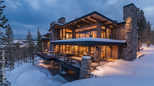 house, snow, winter, architecture, luxury, home, exterior, building, sky, landscape, modern, design, estate, residence, property, contemporary, illuminated, window, deck, evening, twilight, mountain, tree, stone, wood, light, cold, snowy, nature, hillside, chimney, frost, outdoors, scenic, viewpoint, panoramic, beautiful, season, timber, affluent, rich, vacation, holiday, get-away, shelter, retreat, dwelling