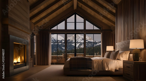 Luxurious mountain cabin bedroom, evening view, cozy fireplace, snowy peaks. Ideal for travel brochures