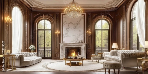Luxurious Parisian apartment interior, ornate white plaster ceiling, crystal chandelier, arched windows, white marble fireplace, elegant tufted chaise lounge, round white coffee table, neoclassical de