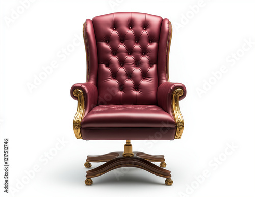 Luxurious red throne chair with golden frame, featuring tufted upholstery and swivel base, perfect for elegant office or study