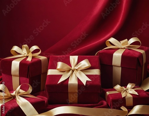 Luxurious red velvet gift boxes with elegant gold ribbons, perfect for holiday celebrations.