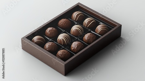 chocolate, truffle, box, gift, dark, brown, sweet, delicious, luxury, epicure, food, dessert, confectionery, treat, valentine, occasion, romantic, elegant, rich, smooth, texture, shiny, high-end, premium, studio, photo, marketing, advertising, cardboard box, product, image, commercial, website, print, design, assortment, white, stripes
