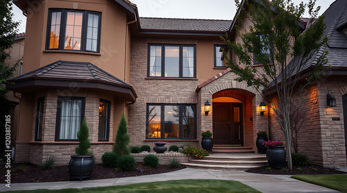 Luxury Home Exterior at Dusk: Captivating Stone Architecture and Landscaping