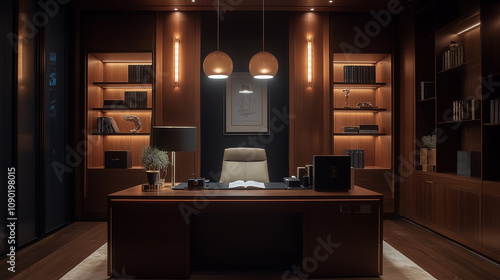 Luxury home office at night with rich wood accents and soft lighting - Sleek desk with high-end decor, soft lighting from pendant lamps, organized and elegant