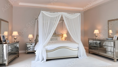 Luxury hotel bedroom interior with comfortable bed, elegant furniture, and a window with curtains