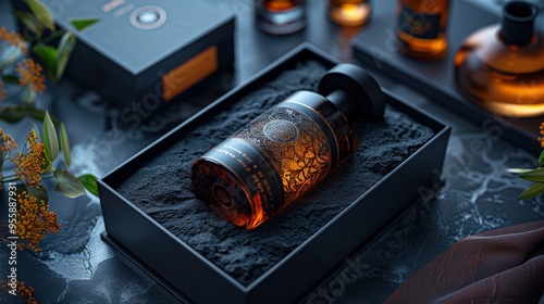 perfume, bottle, fragrance, luxury, cardboard box, black, gold, design, ornate, elegant, premium, gift, present, box, product, branding, marketing, advertising, perfume bottle, gift box, black background, decorative, high-end, scented, aromatherapy