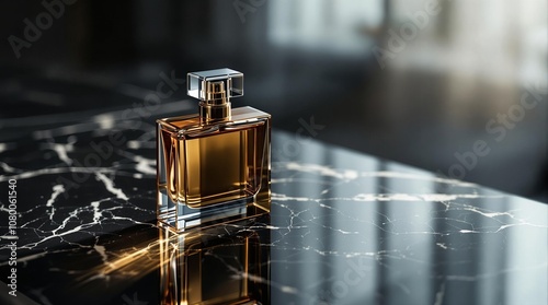 Luxury perfume bottle on elegant marble surface with reflection and natural light