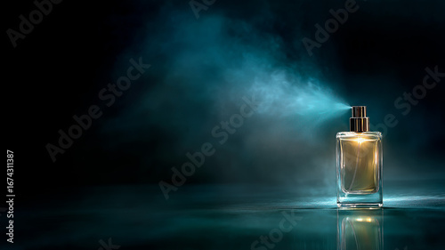 Luxury perfume bottle spraying fine mist on a dark background