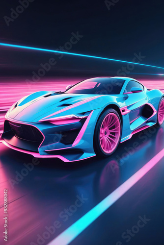 Luxury sports car in neon sky blue and pink lights, powerful acceleration of a supercar.