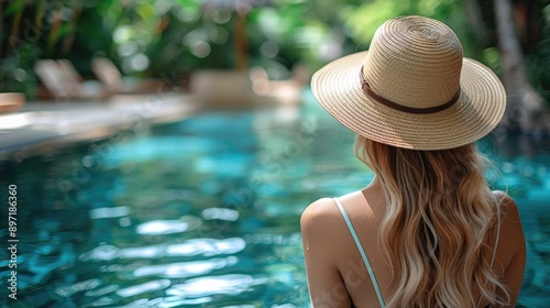 Luxury swimming pool spa resort travel honeymoon destination woman relaxing in infinity pool at hotel nature background summer holiday