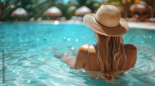 Luxury swimming pool spa resort travel honeymoon destination woman relaxing in infinity pool at hotel nature background summer holiday