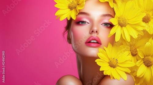 Luxury woman with vibrant yellow and pink makeup adorned with fresh yellow flowers against a vivid pink background ideal for beauty salon promotions.