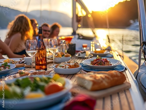 Luxury yacht dinner party at sunset with friends enjoying food and drinks. Close-up of elegant table setting, ocean view, and relaxed atmosphere.