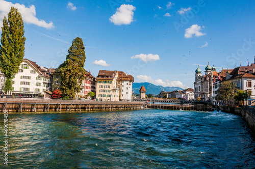 Luzern, Jesuitenkirche, Reuss, Reussbrücke, Kapellbrücke, Altstadt, Nadelwehr, Spreuerbrücke, Holzbrücke, Fluss, Altstadthäuser, Stadtrundgang, Sommer, Rigi, Alpen, Vierwaldstättersee, Schweiz