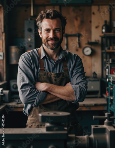 machinist, workshop, metalworking, skill, tool, craftsmanship, apron, machinery, production, industry, confident, male, man, equipment, labor, profession, trade, engineering, hand, technology, design, fabrication, precision, workbench, toolshed, artisan, mechanical, innovation, career, expertise, assembly, process, manufacturing, technician, labourer, workspace, environment, safety, quality, life events, dedication