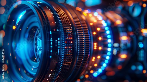Macro Close-Up of Camera Lens with Blue and Orange Bokeh Reflections in Artistic Style