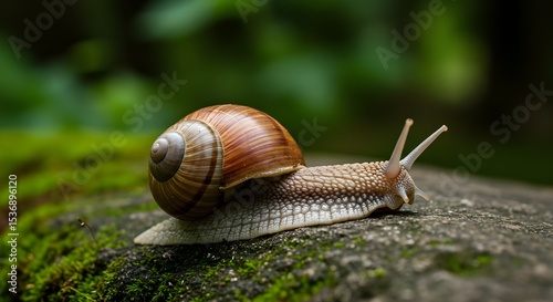 Macro Close-up Photo of Common Garden Snail Crawling on Green Mossy Rock