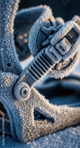 Macro frost crystals on snowboard binding detailed winter sports equipment close up texture minimal natural light