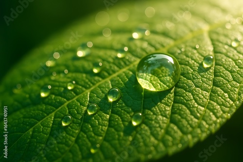 Macro shot of a dewdrop on a vibrant green leaf