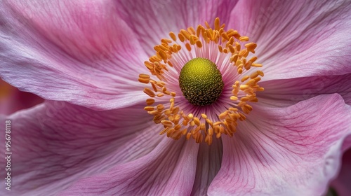 Macro shot of a pink Japanese anemone in bloom, focusing on its intricate petal texture and vibrant center.