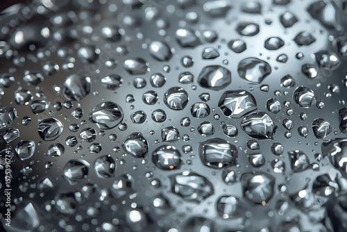 Macro shot of water droplets on a smooth, reflective surface, creating a clean, abstract pattern with cool lighting tones