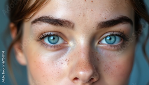 Macro shot of young woman with striking blue eyes, freckles across nose, cheeks. Eyebrows full, defined, framing face. Focus on natural beauty, clear skin, suggesting post-cosmetic procedure focus on