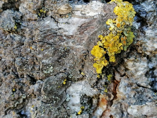 macro texture of birch bark with gold moss . Close up photo