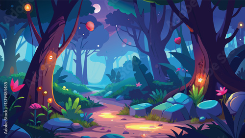 enchanted forest, fantasy, night, tree, glowing, flower, magical, illustration, nature, path, lush, plant, enchanted, glow, dark, mystical, whimsical, dreamlike, pathway, wood, scene, background, artwork, graphic, digital artwork, vibrant, colourful