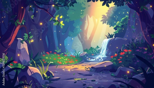 Magical forest landscape. Mystical forest background. Colorful forest landscape. Cartoon games nature background.