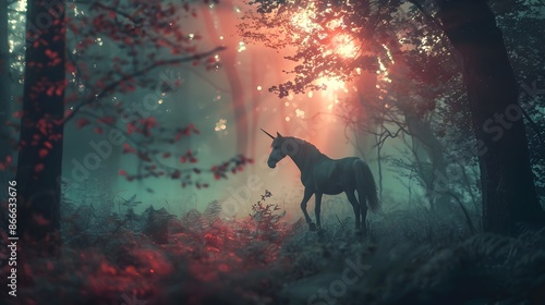 Magical Unicorn Silhouette in Enchanted Misty Forest Landscape