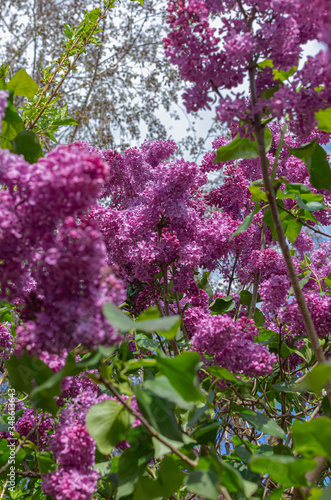 Magnificent fresh bunch of purple lilac on the bush. Garden bush, spring flowering, fresh aroma. Selective soft focus, shallow depth of field.