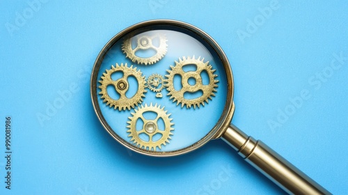 Magnifying glass examining gears on a blue background, representing the detailed analysis involved in an SEO audit