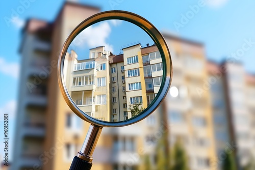 Magnifying glass on top of a city building, symbolizing search and analysis in business and finance
