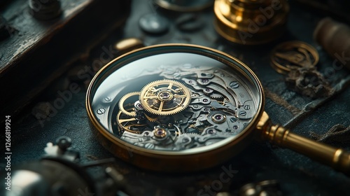 watch, gear, magnifying, glasses, clock, mechanism, intricate, detail, time, precision, antique, vintage, gold, brass, metal, mechanical, movement, craftsmanship, artistry, engineering, complex, delicate, component, part, wheel, cog, spring, gem, ruby, sapphire, tool, repair, restoration, close, up, macro, photo, background, texture, surface, dark, shadow, light